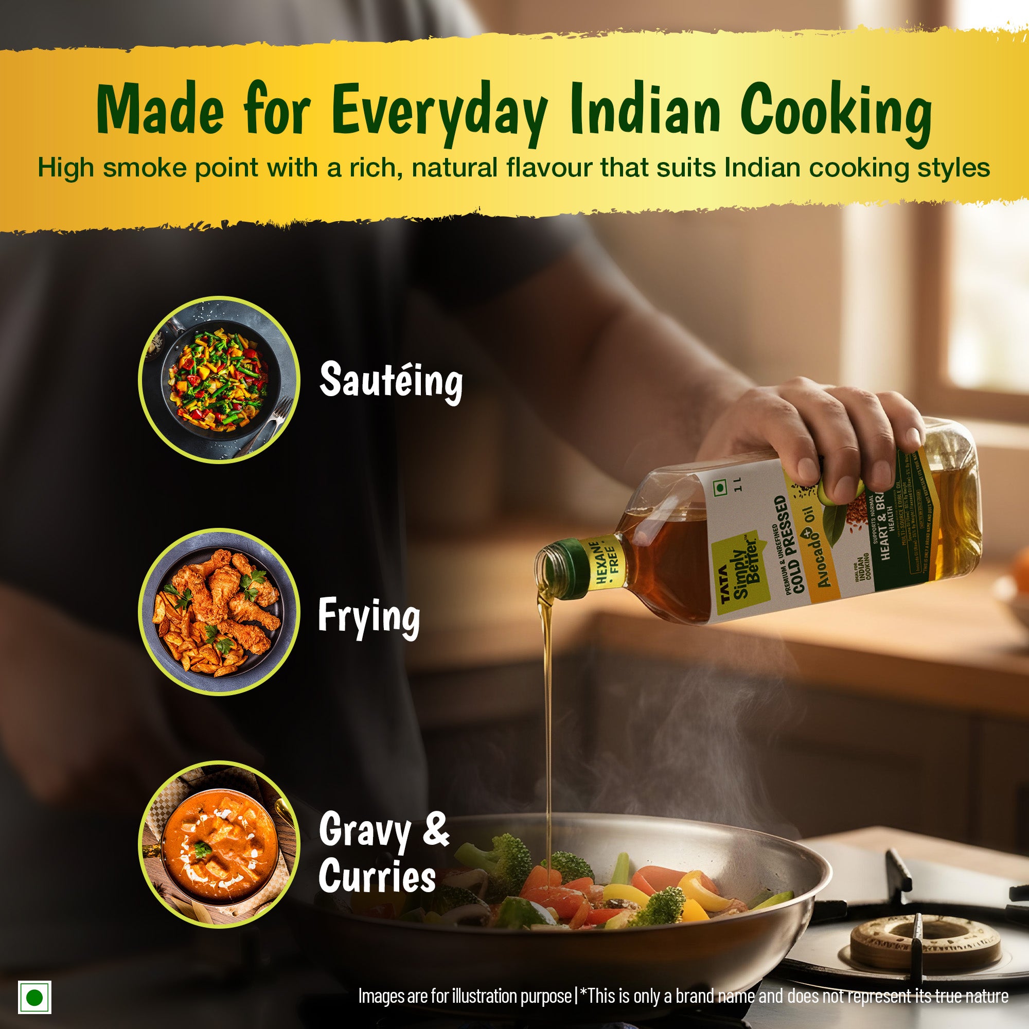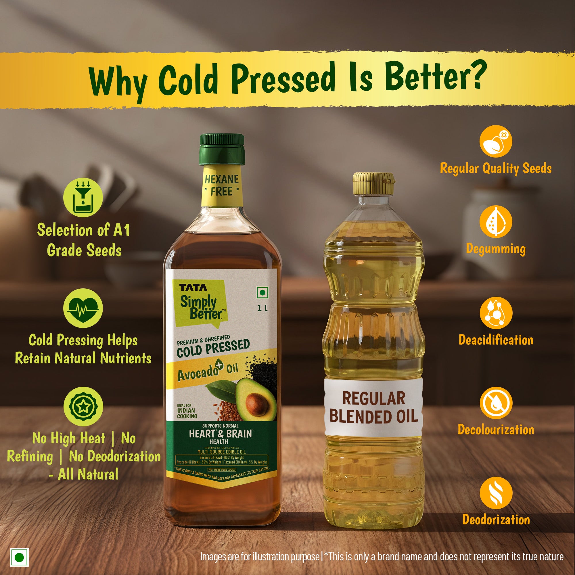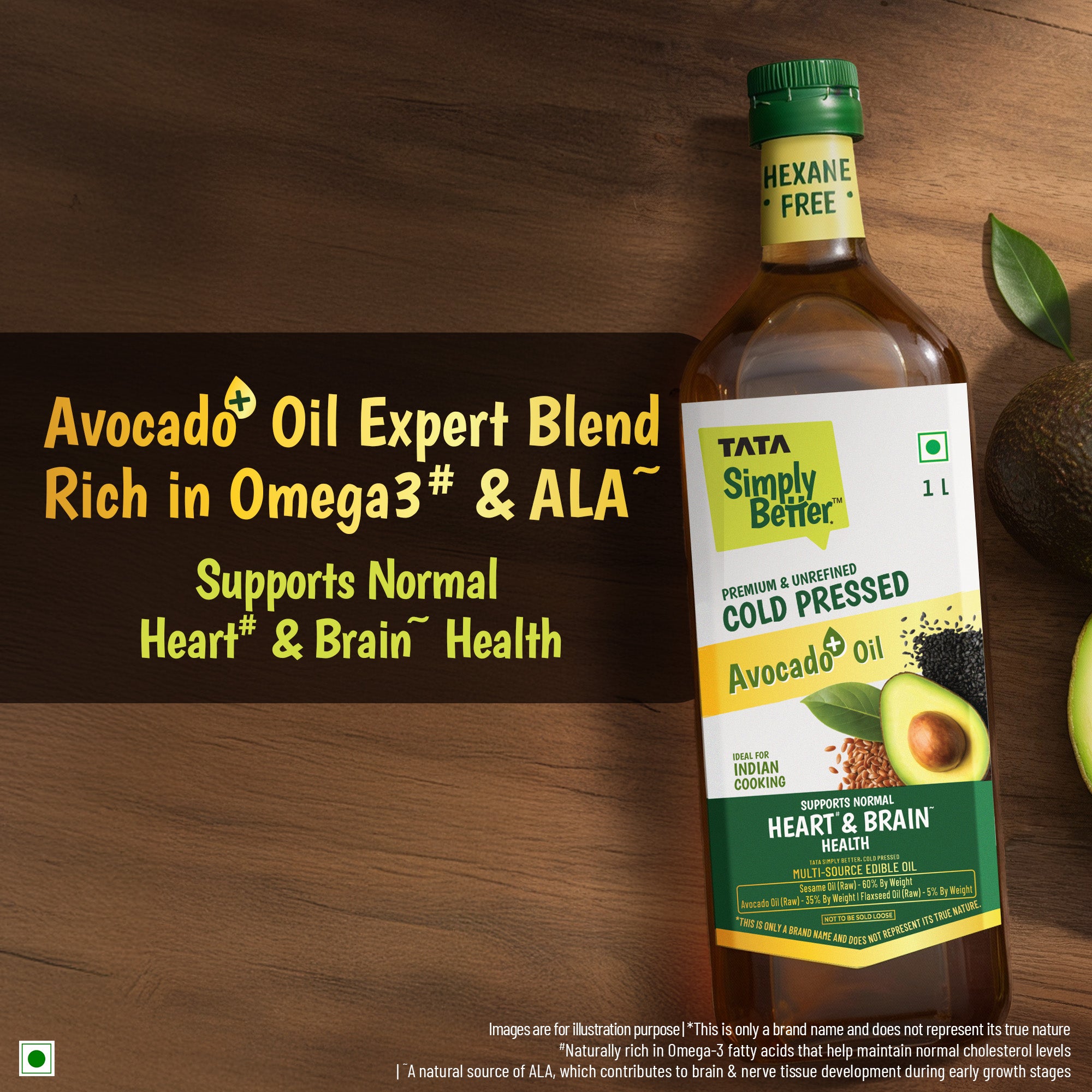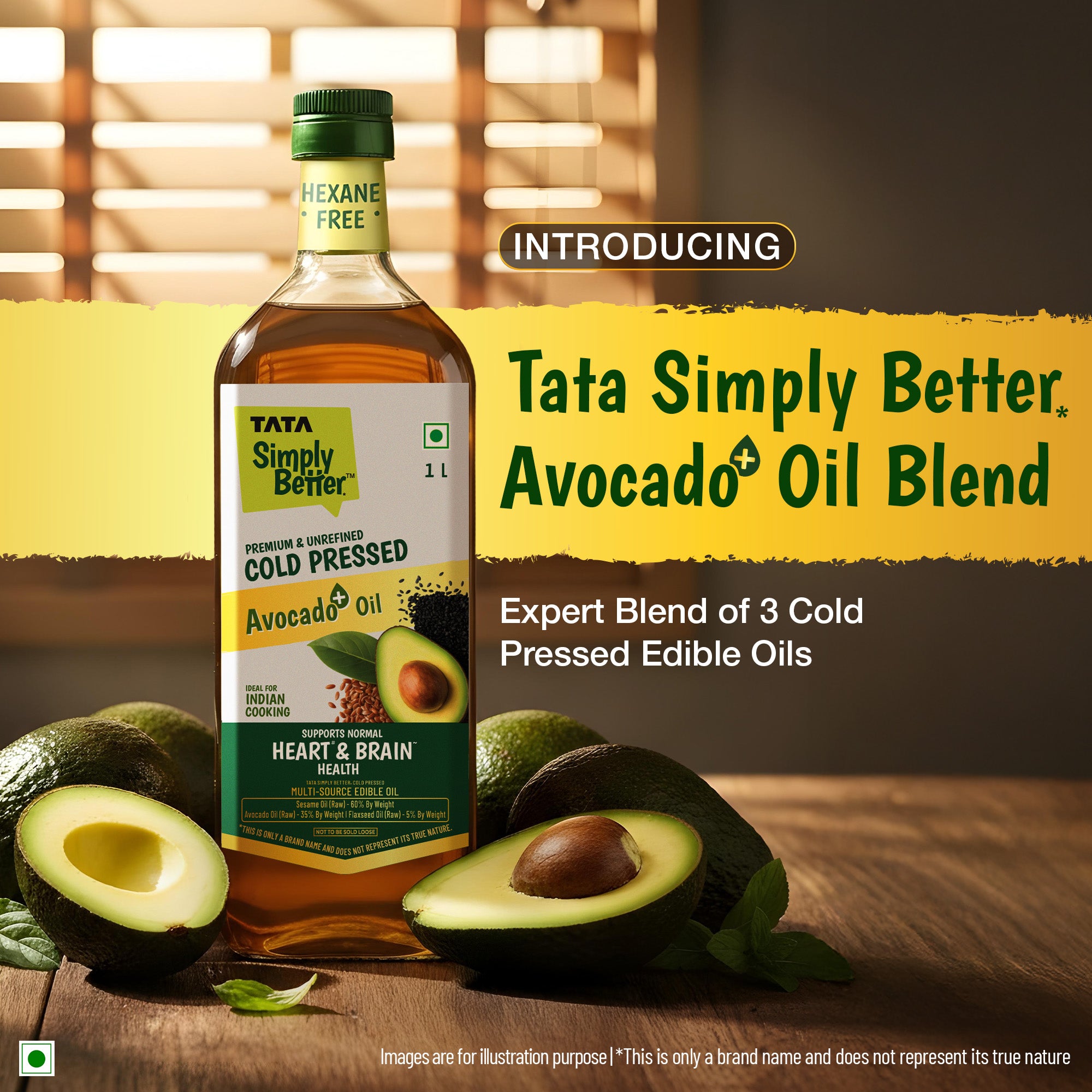 Premium & Unrefined Cold Pressed Oil: Tata Simply Better Avocado+ Oil is a premium, unrefined edible oil extracted using the cold-pressed method, which helps retain the natural characteristics and quality of the oils