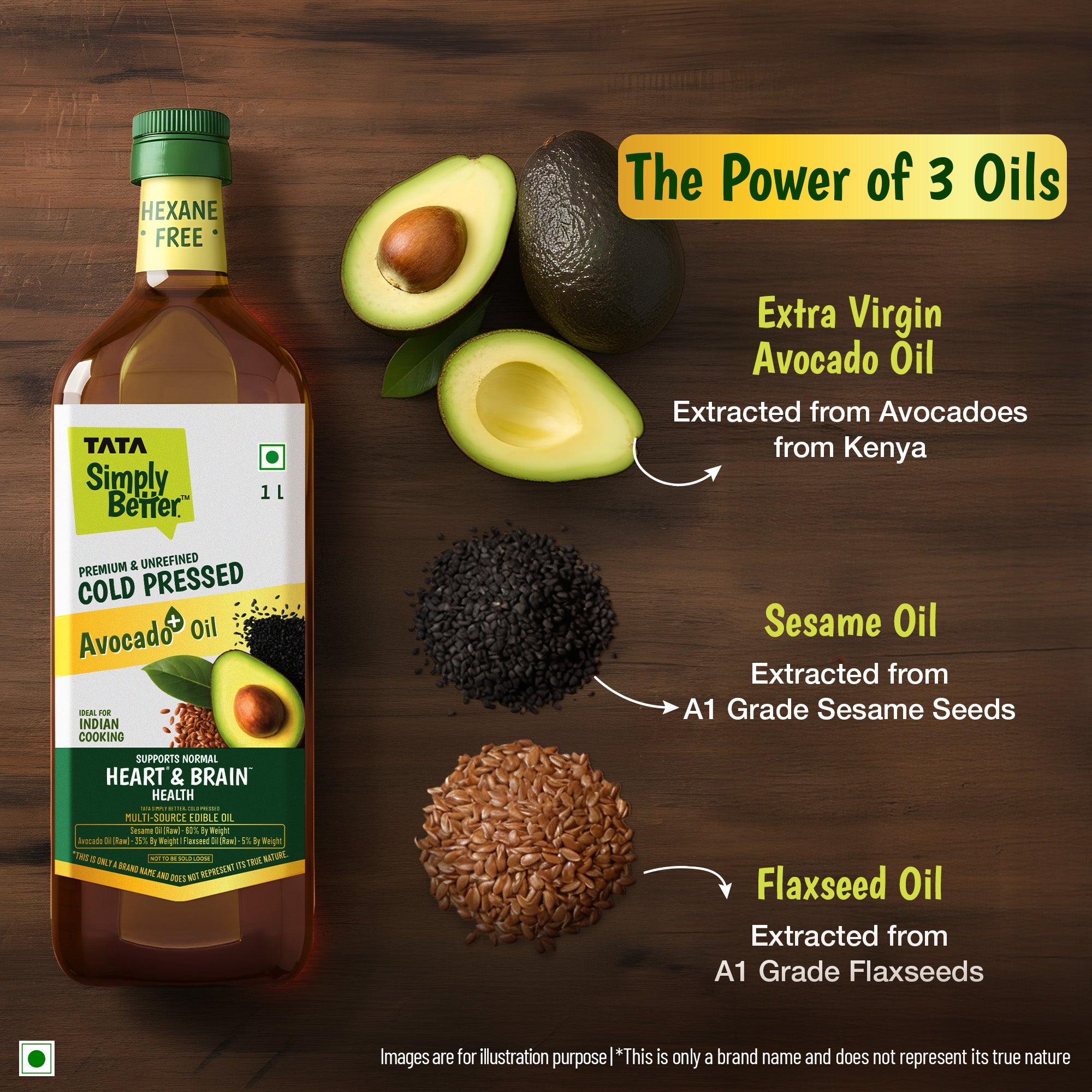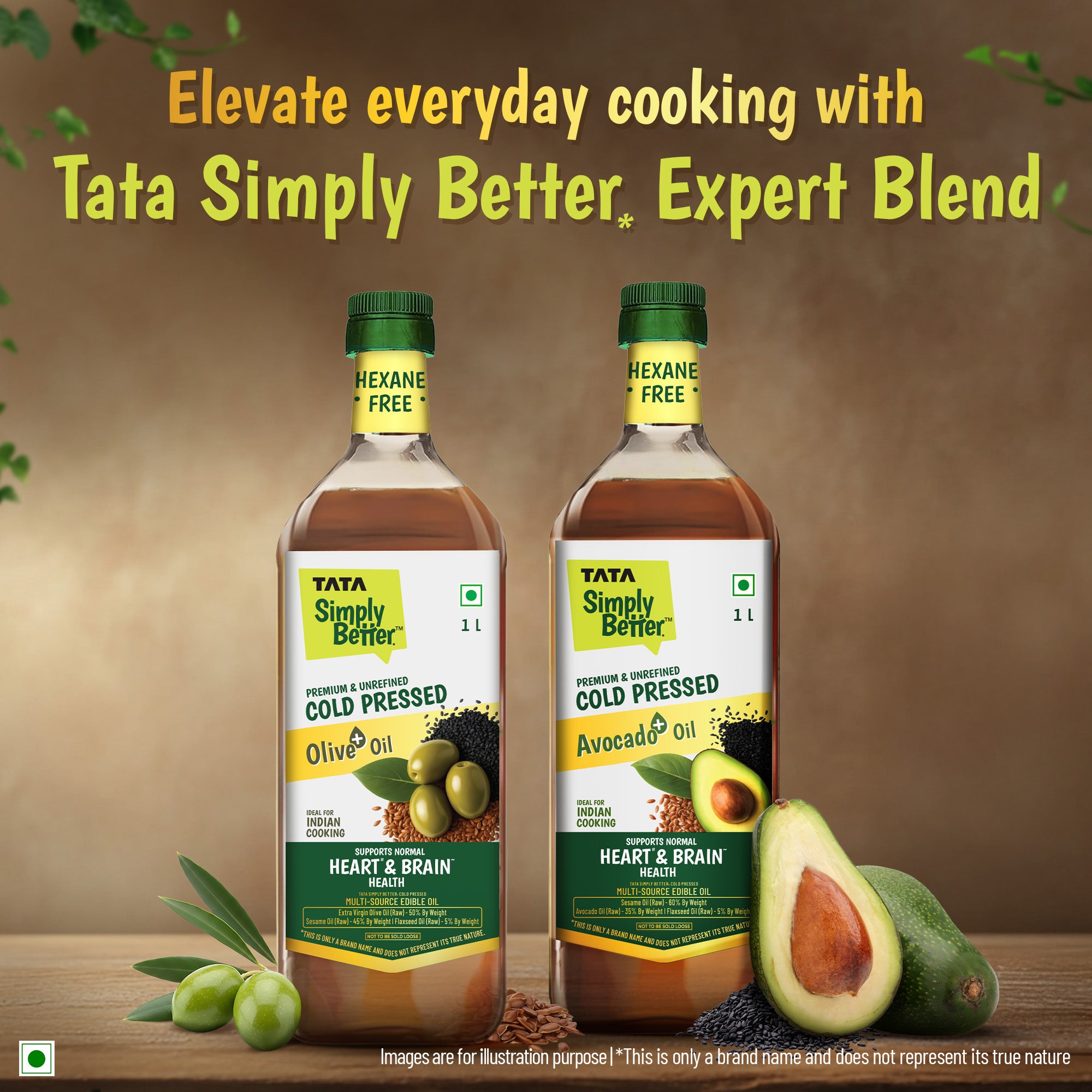 A balanced blend, made for healthy everyday cooking! We bring you the goodness of carefully selected oils with Tata Simply Better Avocado+ Oil, a premium and unrefined cold pressed multi-source edible oil. Extracted using the cold-pressed method, this oil helps retain the natural characteristics of the oils, making it suitable for everyday Indian cooking. Tata Simply Better Avocado+ Oil is extracted without hexane solvents, using a cleaner extraction process. It is a thoughtfully formulated blend of Avocado Oil (35%), Sesame Oil (60%), and Flaxseed Oil (5%). This oil contains MUFA, PUFA and Omega 3 & 6, which support normal heart and brain health when consumed as part of a balanced diet. So without giving a second thought, make Tata Simply Better Avocado+ Oil your everyday cooking partner and a part of your daily routine.
