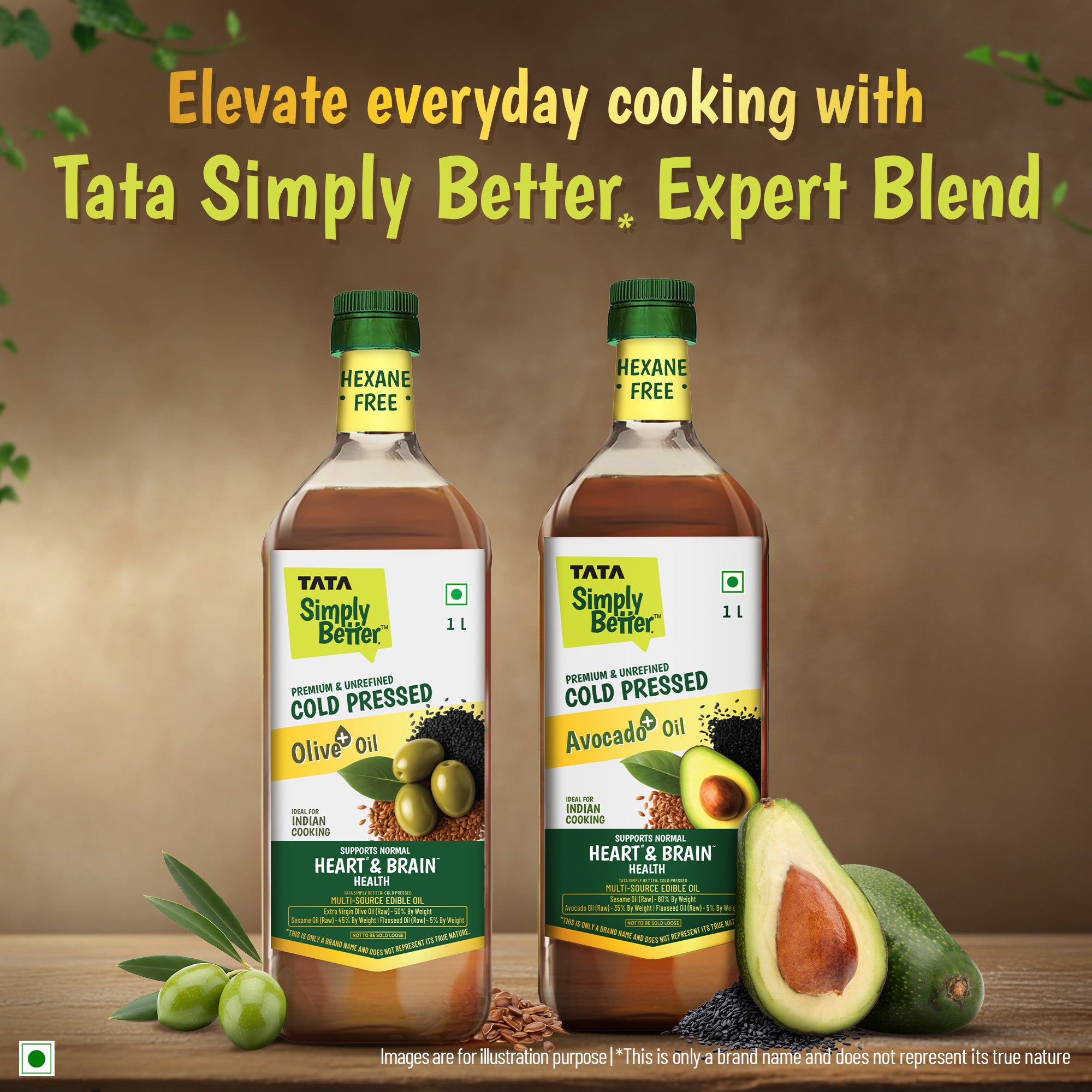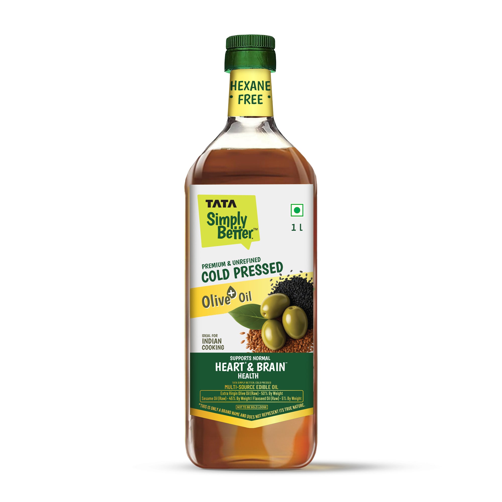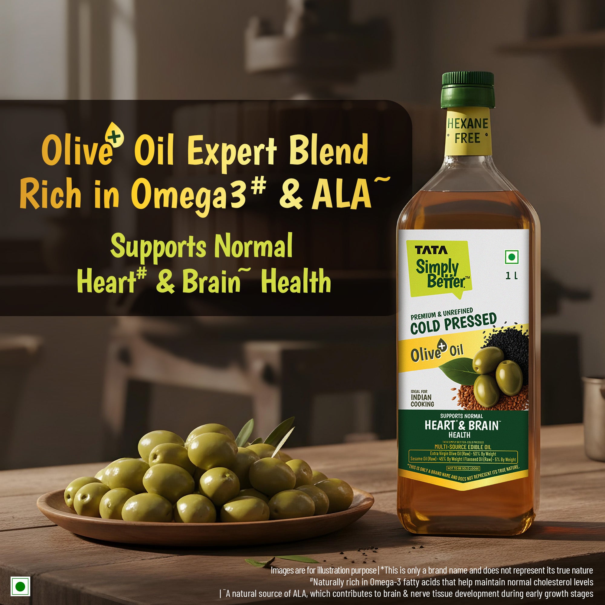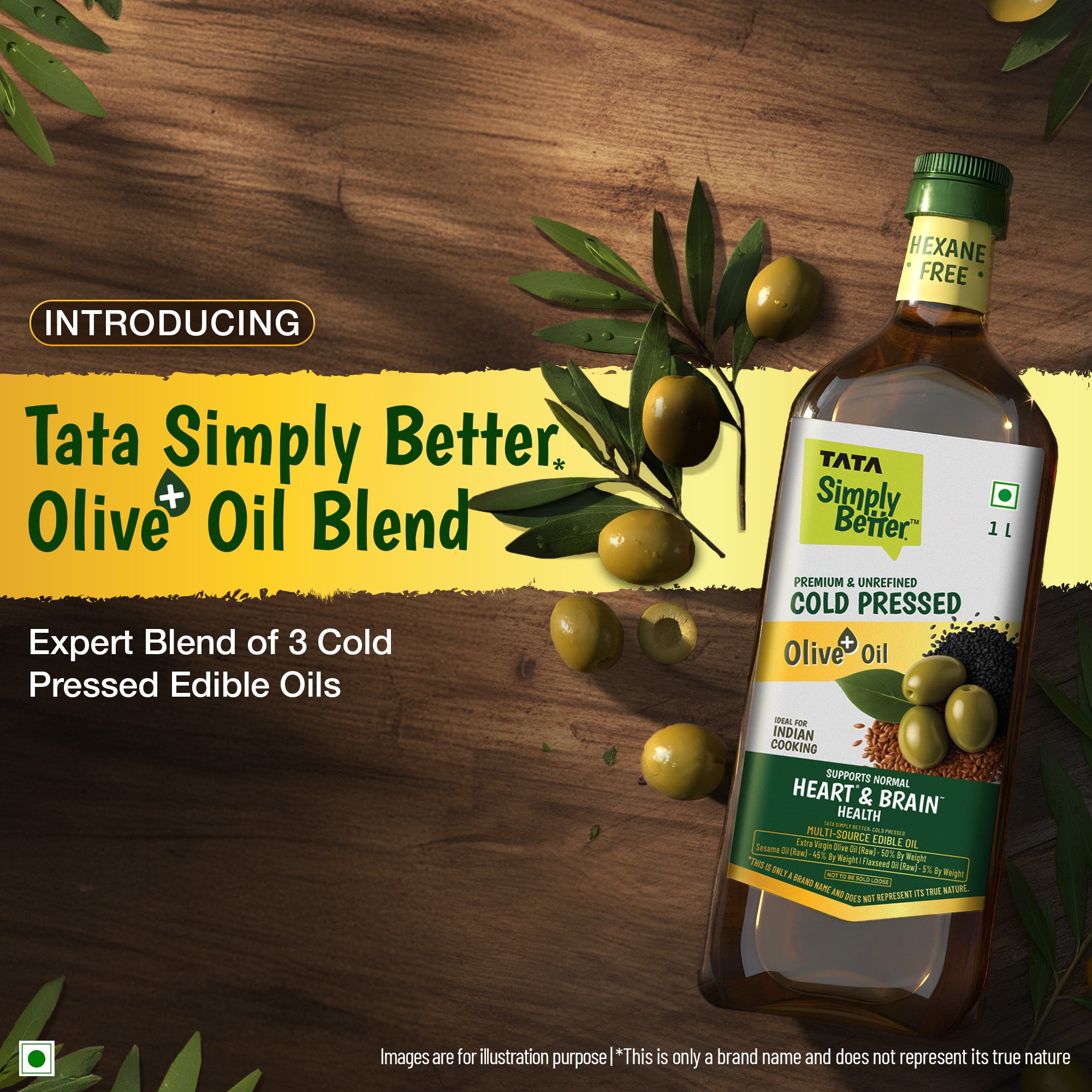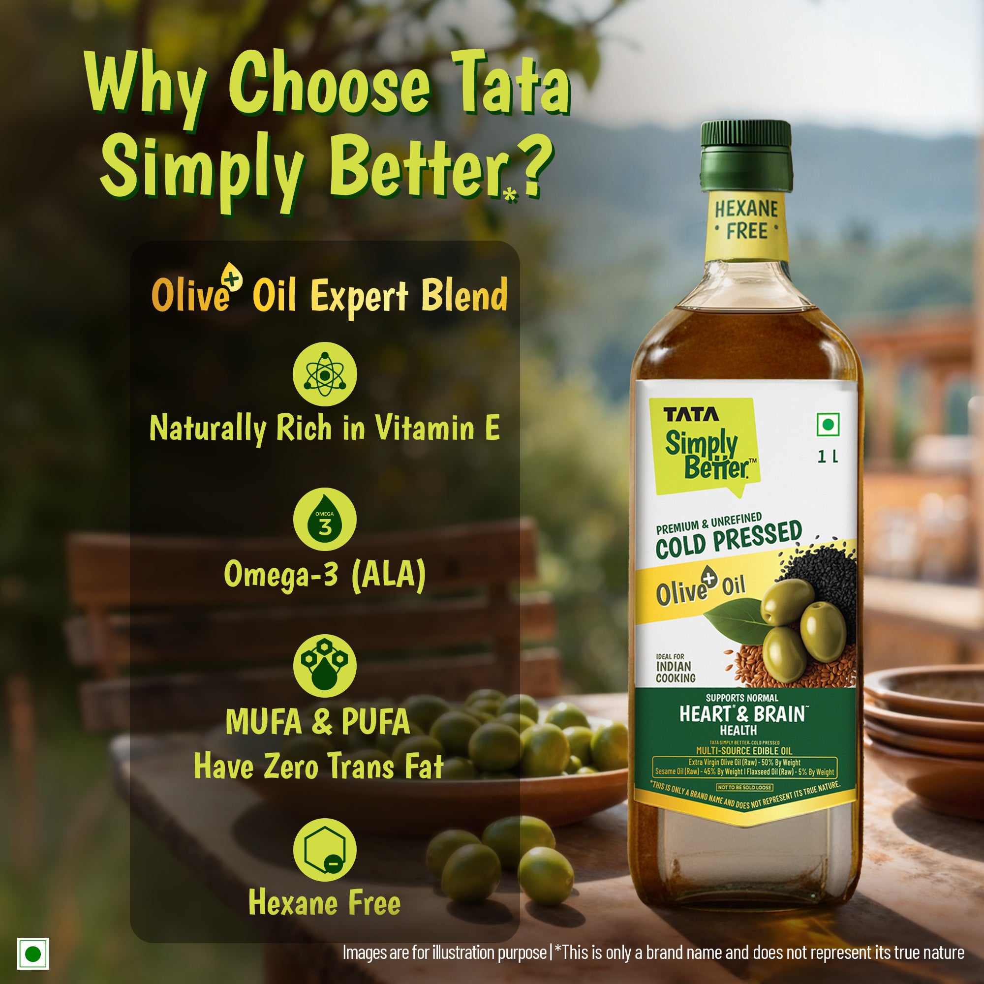 A balanced blend, made for healthy everyday cooking! We bring you the goodness of carefully selected oils with Tata Simply Better Olive+ Oil, a premium, unrefined, cold-pressed edible oil. Extracted by cold pressing, this oil helps retain its natural properties, making it suitable for everyday Indian cooking. Tata Simply Better Olive+ Oil is extracted without hexane or other chemical solvents, ensuring a cleaner extraction process. It is a carefully balanced multi-source blend of Extra Virgin Olive Oil (50%), Sesame Oil (45%), and Flaxseed Oil (5%). This oil contains MUFA, PUFA, and Omega-3 & -6 fatty acids, which support normal heart and brain health when consumed as part of a balanced diet. So, without giving it a second thought, make Tata Simply Better Olive+ Oil your everyday cooking partner and part of your daily routine.