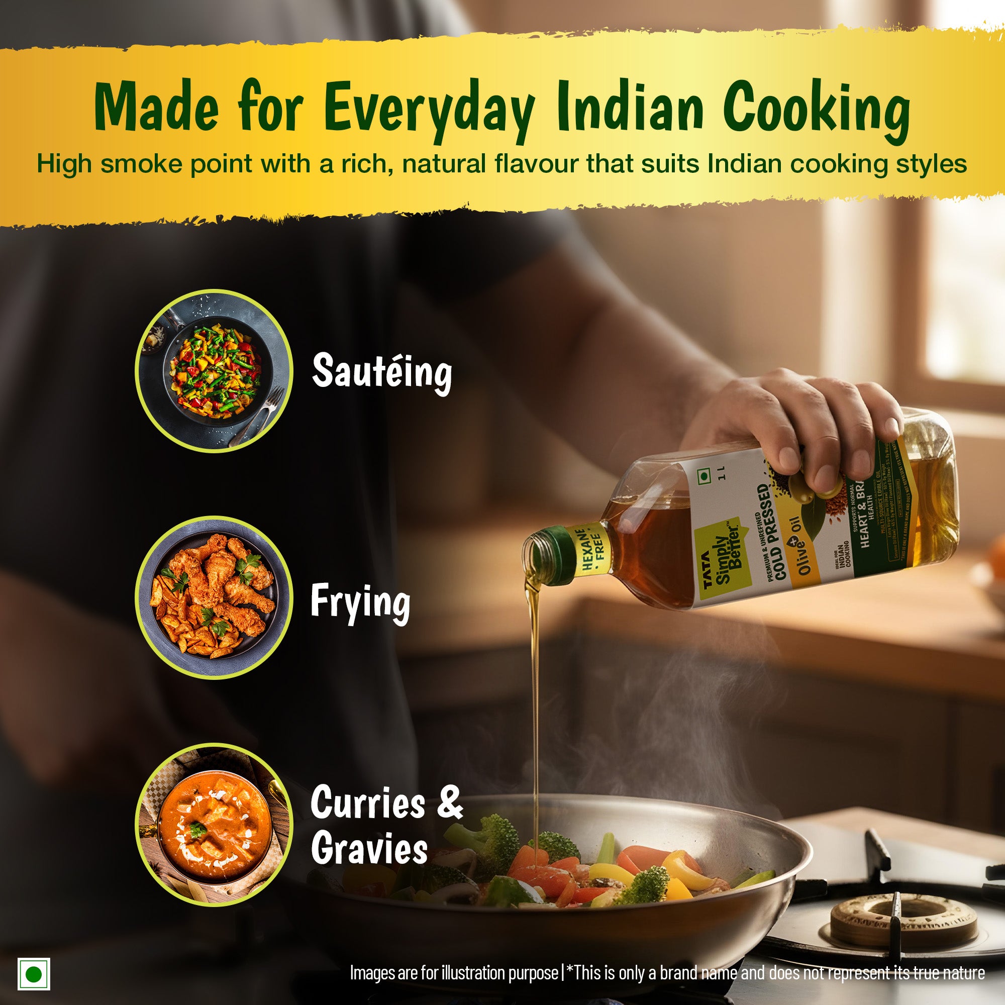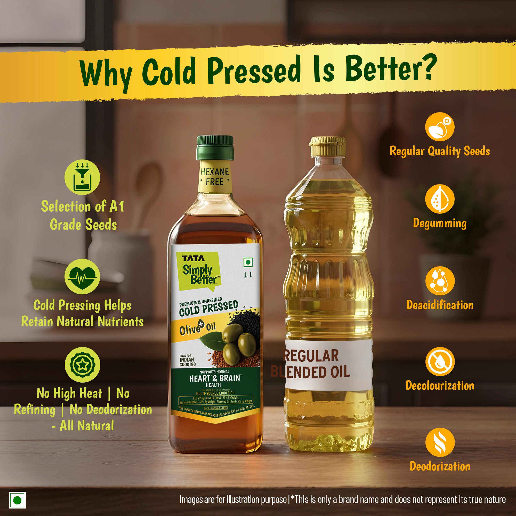 Premium & Unrefined Cold Pressed Oil: Tata Simply Better Olive+ Oil is a premium, unrefined edible oil extracted using the cold-pressed method, which helps retain the oil’s natural characteristics, taste, and quality