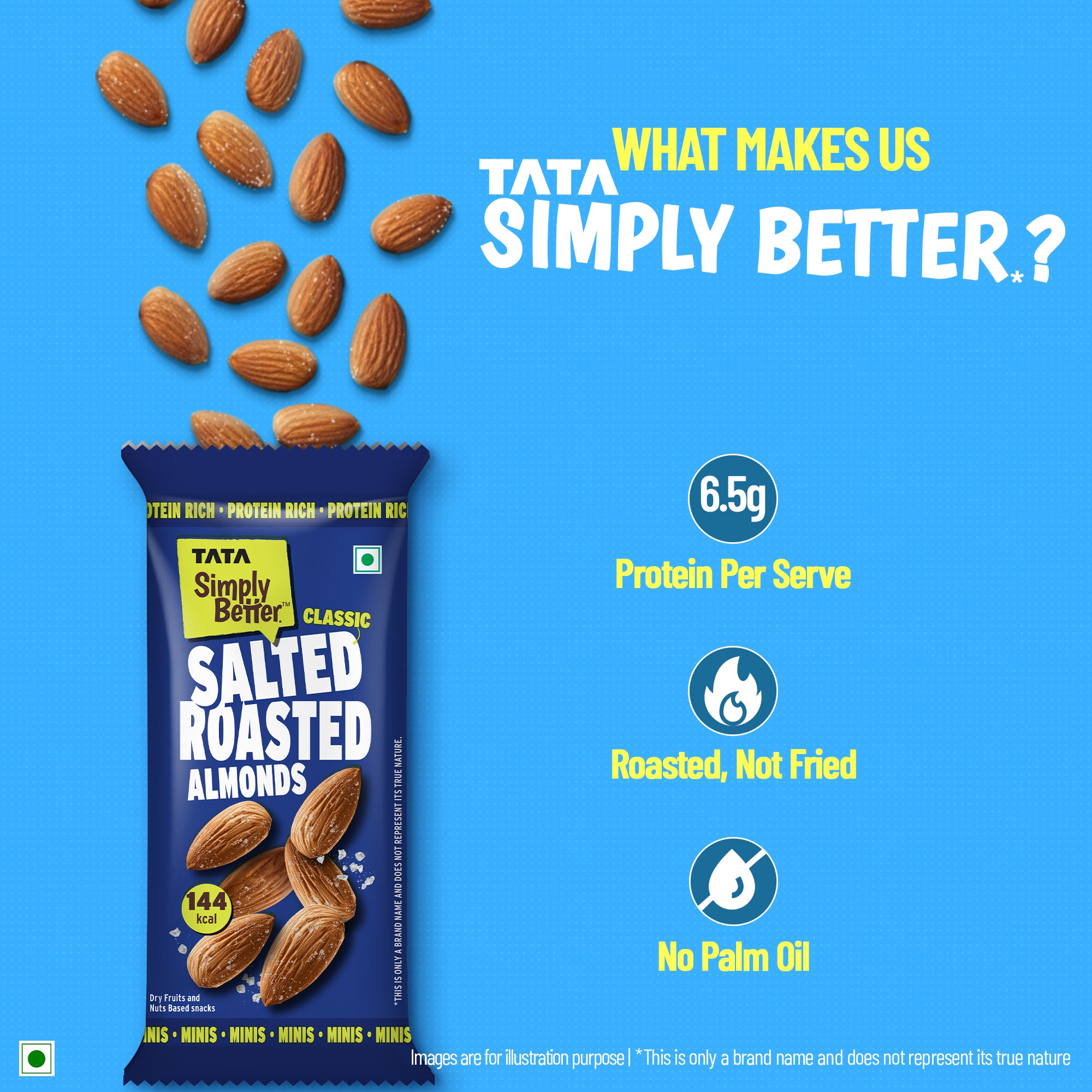 Relish the rich crunch and earthy flavour of whole almond nuts with Tata Simply Better Classic Salted Roasted Almonds. Each almond is expertly slow-roasted to perfection and delicately seasoned with just the right amount of salt, creating a harmonious balance that highlights their inherent nutty goodness without masking it. The result is a premium snacking experience that’s both indulgent and nourishing, offering a taste of almonds in their most delicious form.